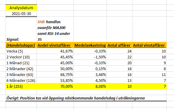Som ni kan se ovan så såg aktien översåld ut (RSI-14) samtidigt som vi befann oss i en positiv grundtrend (över MA200) så därför gjorde jag backtesting på en signal som sammanfogar MA200 samt RSI-14. Mina prenumeranter fick då tillgång till följande tabell.