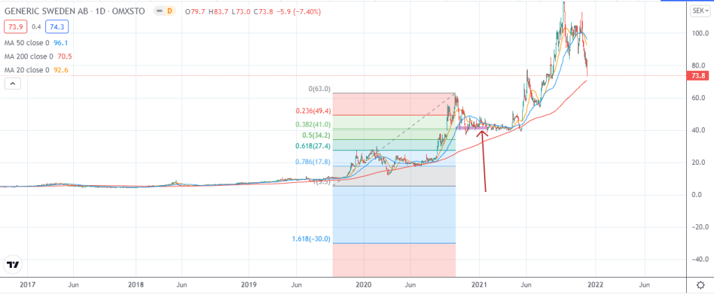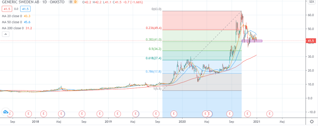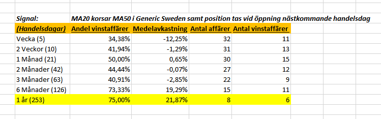 Idag har jag gjort backtesting på ett bolag som heter Generic Sweden. I fredags fick vi se att RSI-14 korsade värdet 30 ovanifrån samtidigt som aktien befinner sig över MA200, vilket är ett tecken på en rekyl i en positiv grundtrend. Senast jag gjorde backtesting på aktien var i december förra året. Då kollade jag på signalen MA20 korsar MA50 samt delade med mig av följande graf samt tabell.