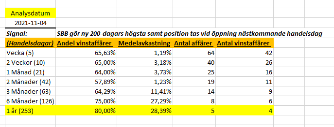 Idag har jag gjort backtesting på Pandox samt Stora Enso. Vi fick se att MA20 korsade MA50 i Pandox idag samtidigt som vi fick se ett gyllene kors (MA50 korsade MA200) i Stora Enso och frågan är om båda dessa signaler kan skvallra om kommande uppgångar i dessa bolagen. Det försöker mina tabeller svara på som exempelvis kan se ut som den nedan.