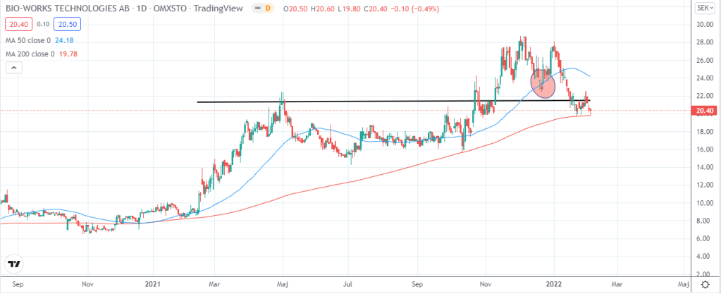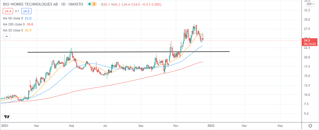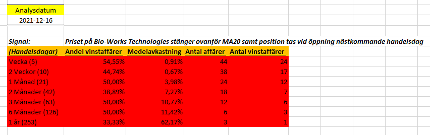 Idag har jag gjort en statistisk analys på bolaget Bio-Works då aktien kan anses översåld ifall vi kollar på RSI-7 (som mäter styrkan i aktien på kortare sikt). Jag gjorde senast en analys på bolaget i december förra året då jag fick in den som ett önskemål. Då såg aktien ut som nedan: