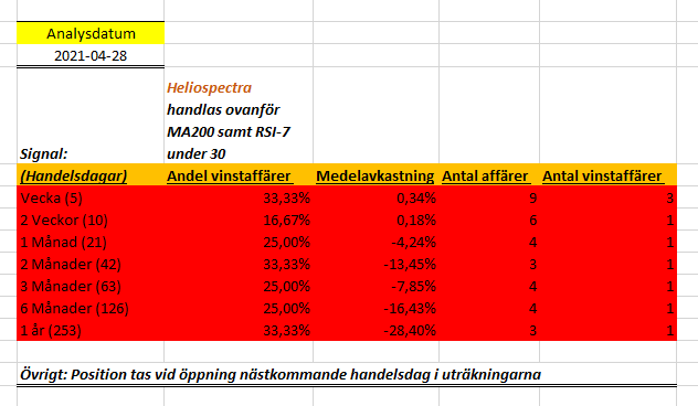 Idag fick vi se att MA20 korsade MA50 underifrån i både Heliospectra samt Nordea så därför har jag analyserat dessa bolagen för att se ifall sannolikheten för uppgång är stor framöver eller ej. Senast jag gjorde backtesting på Heliospectra var förra våren och då fick mina prenumeranter tillgång till följande tabell: