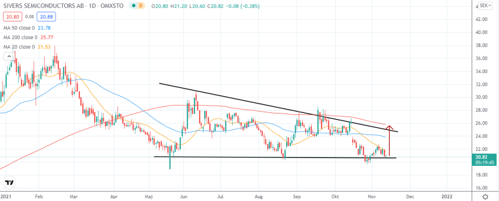 ”Den här aktien befinner sig i något som liknar en fallande triangelformation. I 54% av fallen så brukar dessa leda till ett utbrott på nedsidan (alltså är det en negativ formation). Det finns en sak som jag dock anser är positivt och det är att aktien befinner sig långt ifrån MA200 och vi brukar få uppstudsar när så är fallet”.