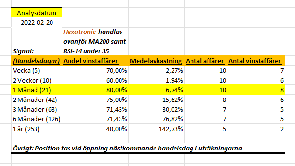 Senast jag gjorde backtesting på Hexatronic var den 20:e februari och då delade jag med mig av följande graf, tabell samt tankar till mina prenumeranter.