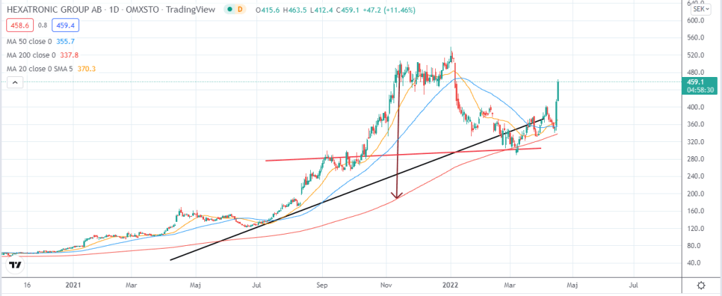 ”I skrivande stund så ser vår risk/reward mycket bättre ut då vi dels har den stigande trendlinjen som fungerar som ett stöd och ifall inte den skulle hålla så har vi MA200 samt den röda linjen (som skapats av tidigare toppar) som fungerar som stöd. Vår potentiella uppsida ser alltså mycket större ut kontra nedsidan”.