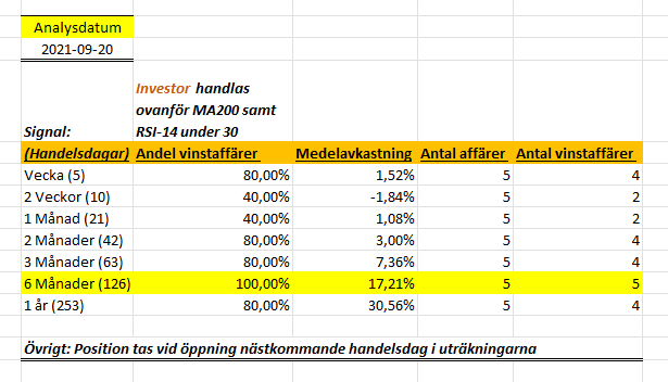 Idag har jag gjort backtesting på Investor då vi fick se RSI-7 korsa värdet 30 i fredags samtidigt som aktien precis befinner sig ovanför MA200 (positiv grundtrend). Senast jag gjorde en analys på Investor med en liknande signal var förra året då jag kollade på RSI-14 i stället. Då skrev jag följande: