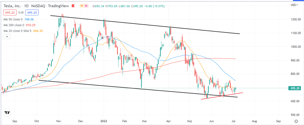 Senast jag gjorde en backtesting på Tesla efter önskemål var i början av förra månaden och då skrev jag följande ”Här är min gissning att vi kommer fortsätta till MA50 och att vi sedan kommer ta sikte mot MA200 då vi som sagt befinner oss i botten av trendkanalen”. Vi kan se nedan att det var vad som precis skedde.