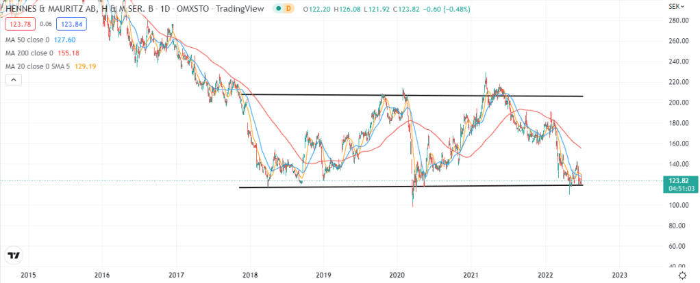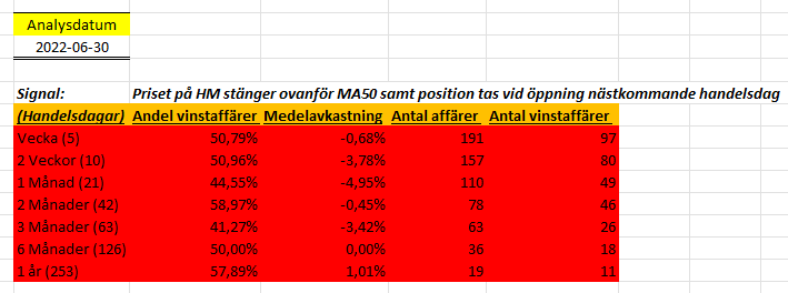 Dagens analys är på bolaget H&M då aktien befinner sig långt under MA200 samtidigt som RSI-14 korsade värdet 30 ovanifrån i fredags (två tecken på översåldhet).