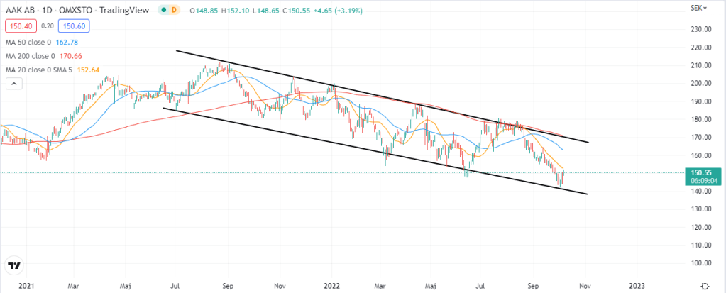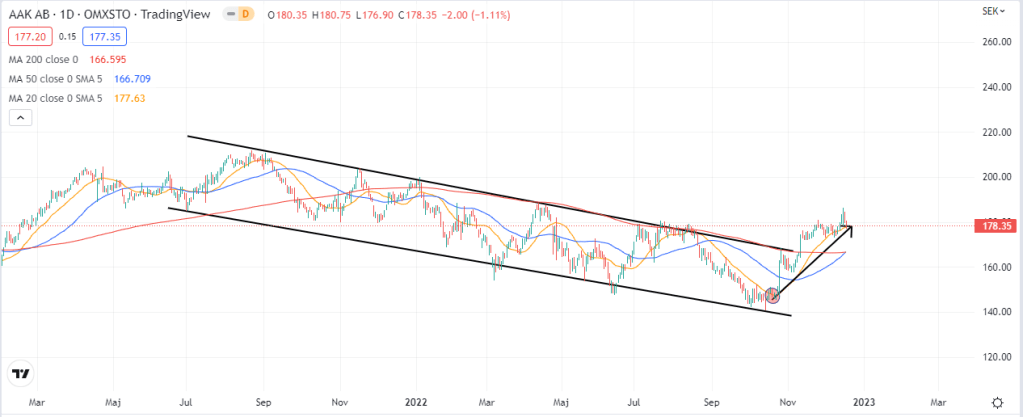Idag har jag gjort en analys på AAK då vi fick se MA50 korsa MA200 underifrån i fredags. Senaste gången jag gjorde en analys på aktien var i början av oktober (då en önske-analys) där jag kollade hur aktien brukar reagera när den stängt ovanför MA20.