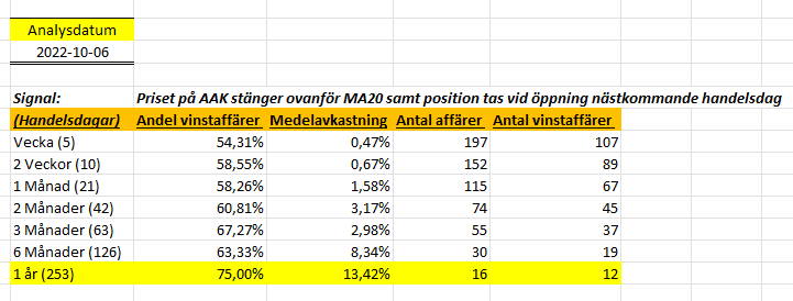Mina prenumeranter kunde då se att det fanns en edge ifall position togs nästkommande handelsdag efter att aktien stängt ovanför MA20. Hur har då aktien utvecklats efter att den signalen visade sig?