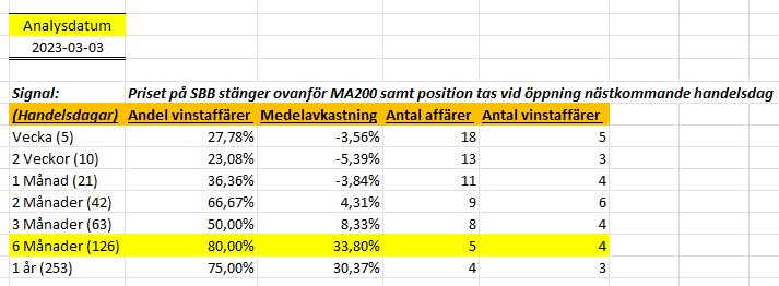 Det var längesedan jag gjorde en gratis-analys (måste varit nästan ett år sedan) så tänkte att det kan vara dags för en sådan och idag har jag gjort en analys på SBB där jag kollar hur aktien brukar utvecklas när den stänger ovanför MA200.