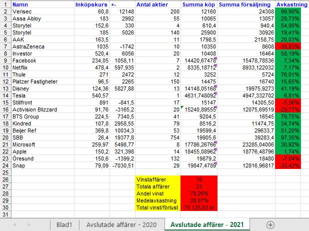 Kan avslöja att den här gången har jag en utveckling på 111,05% samtidigt som börsen har en utveckling på 40,63% vilket ger mig en överavkastning på 70,42%-enheter, så min modell fortsätter att leverera.