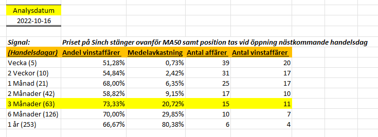 Hade jag bara tur att jag köpte på något som liknar en botten samt sålde på toppen? Skulle säga att svaret är nja då man aldrig kan veta ifall något skall gå upp eller ej utan gäller att räkna på saker vilket inte bara påverkas av ren tur utan man måste även veta vad man gör. I fallet ovan så visste jag redan när jag tog position att jag skulle sälja mina aktier den 13 januari det här året och hade jag inte vetat det så hade jag antagligen tänkt att jag vill ”ha mer” och varit med på nedgången och sålt då i stället. Det är därför dessa tabeller är A och O då mina prenumeranter vet i förväg när de skall sälja bolagen enligt statistiken för att med en så stor sannolikhet som möjligt komma ut i en vinstaffär.