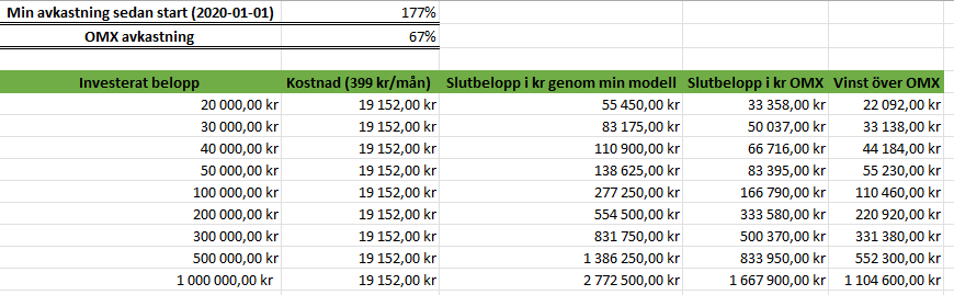 Tjänsten kostar 399 kr/mån och skulle säga att priset är lågt ifall man kollar hur modellen levererat sedan start och vilka avkastningar den har levererat. Ni kan själva börja handla med hjälp av modellen via knappen nedan.