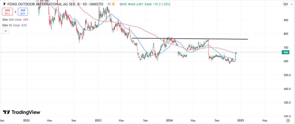 Dagens analys är på Fenix Outdoor och den aktien ser ut som nedan i skrivande stund.