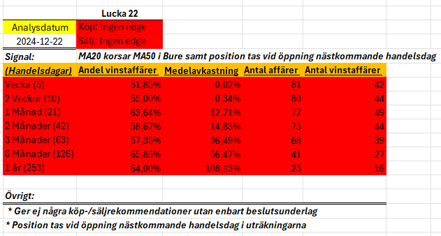 Den här aktien ser ut att ”rulla över” till en negativ trend då vi kan se att den toppade i höstas. Här är min gissning att vi skall ta fart uppåt den negativa trendlinjen för att sedan återigen ta fart nedåt. Vi fick se MA20 korsa MA50 underifrån i fredags så därför har jag gjort en backtesting på den signalen.