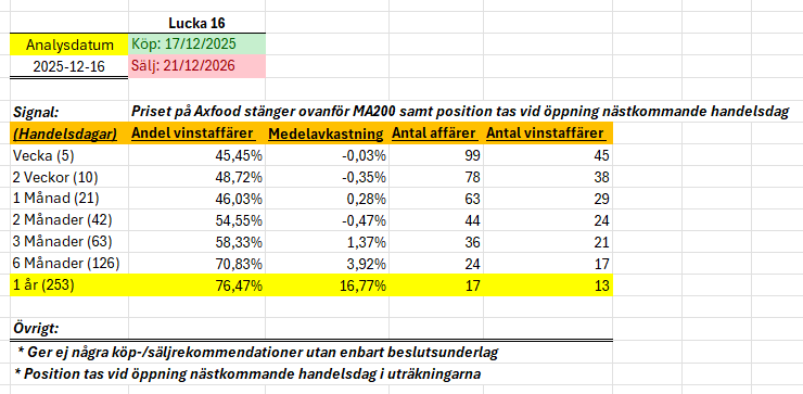 Idag fick vi se Axfood stänga ovanför MA200 så har kollat om vi har en edge på den signalen.